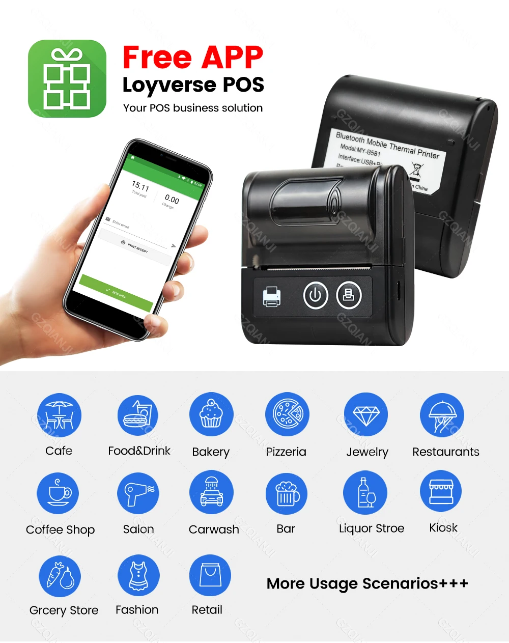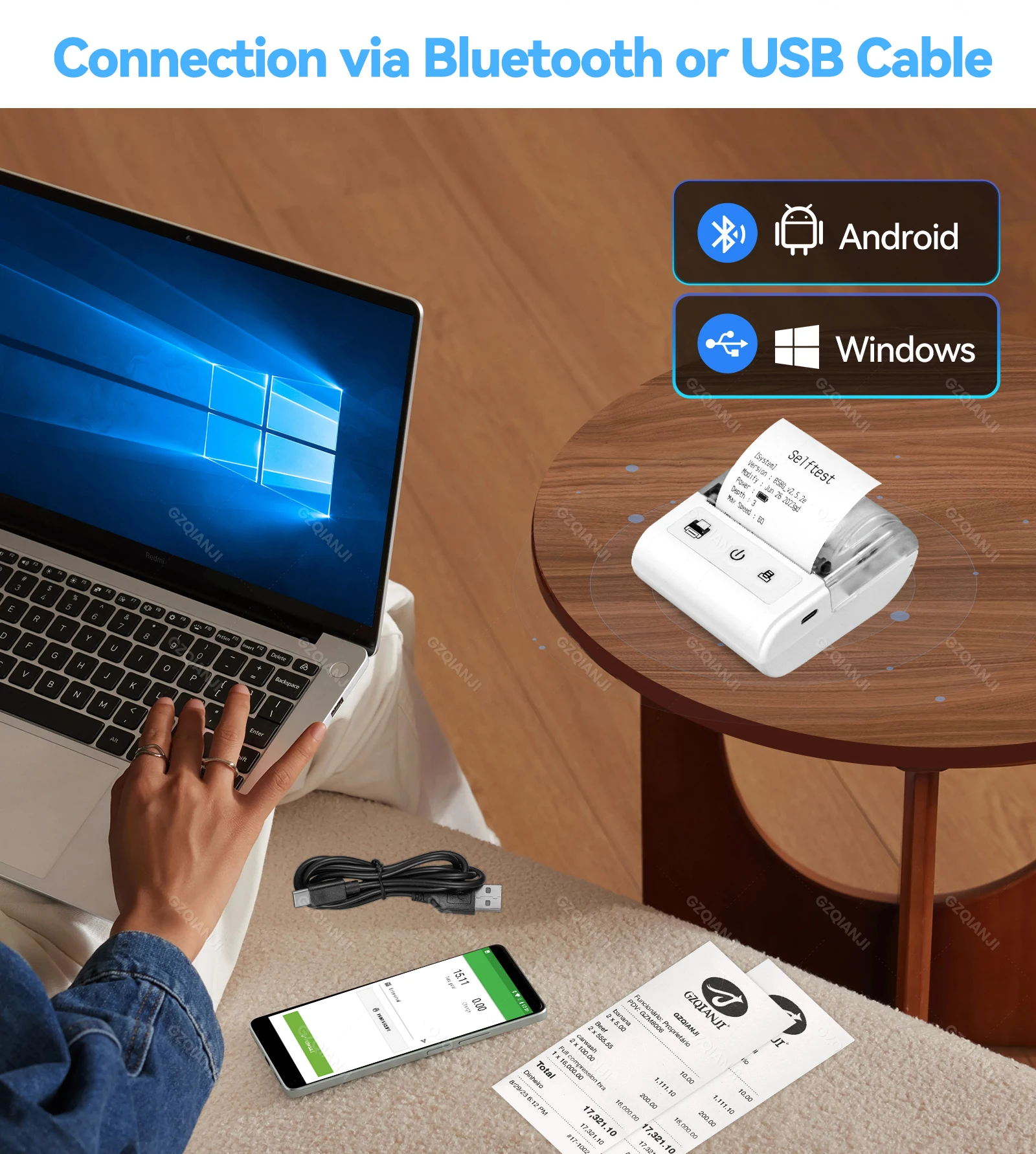 USB and Bluetooth connection, support edit with "Loyverse POS"(software or APP), support ESC/POS command, compatible with Windows XP/7/8/10, Android, iOS.